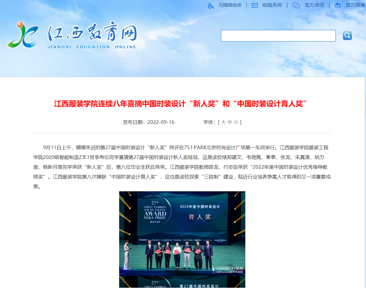 江西省教育厅官网:江西服装学院连续八年喜摘中国时装设计“新人奖”和“中国时装设计育人奖”