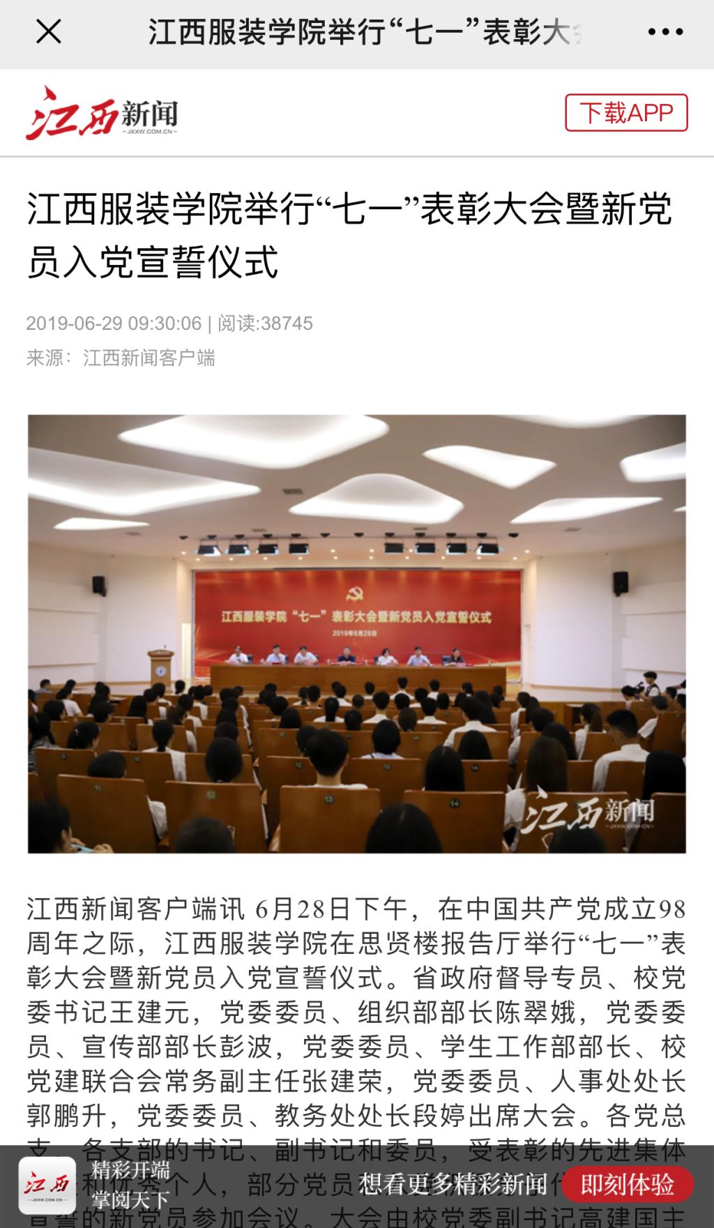 江西新闻对此进行了报道,以下为新闻链接:江西服装学院举行“七一”表彰大会暨新党员入党宣誓仪式