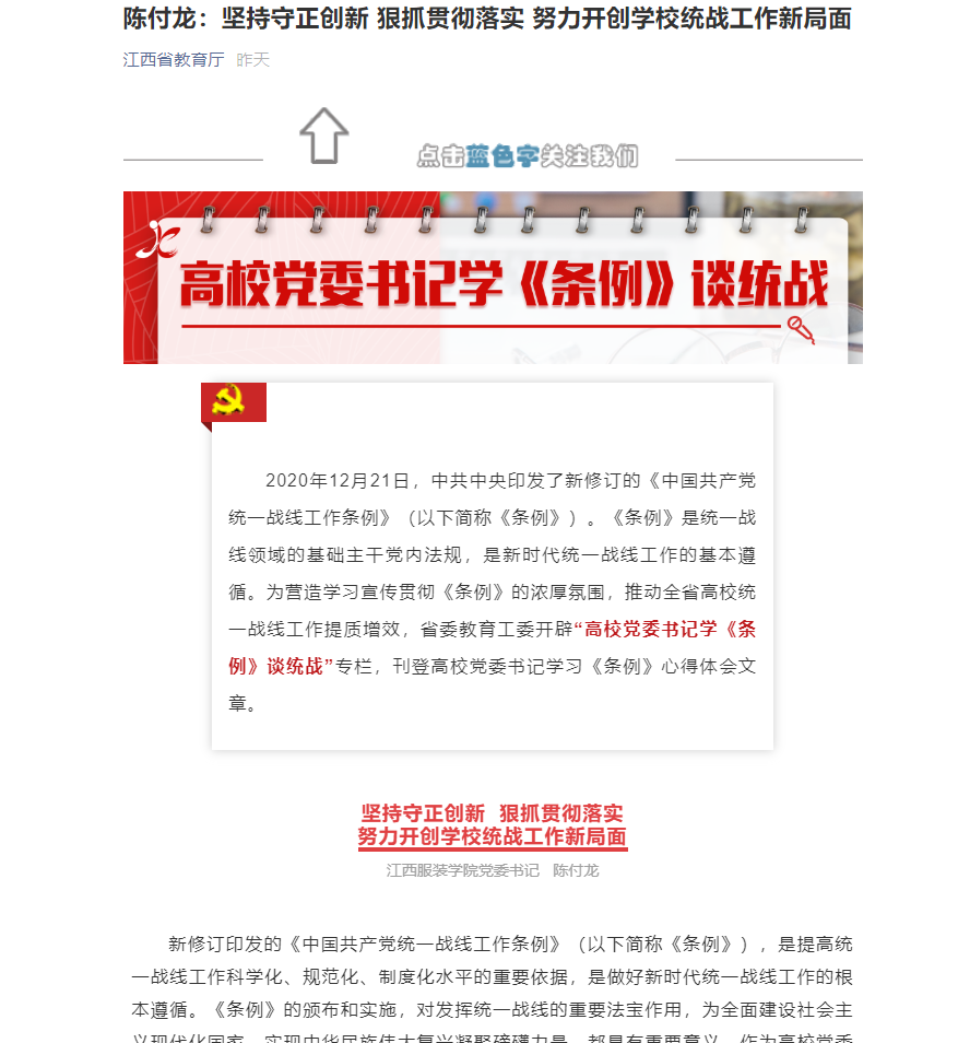 江西省教育厅刊发我校党委书记陈付龙文章:坚持守正创新 狠抓贯彻落实 努力开创学校统战工作新局面