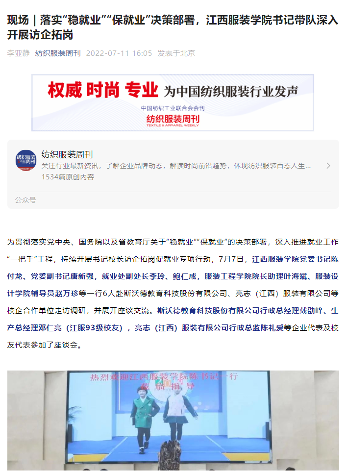 纺织服装周刊:现场 | 落实“稳就业”“保就业”决策部署,江西服装学院书记带队深入开展访企拓岗