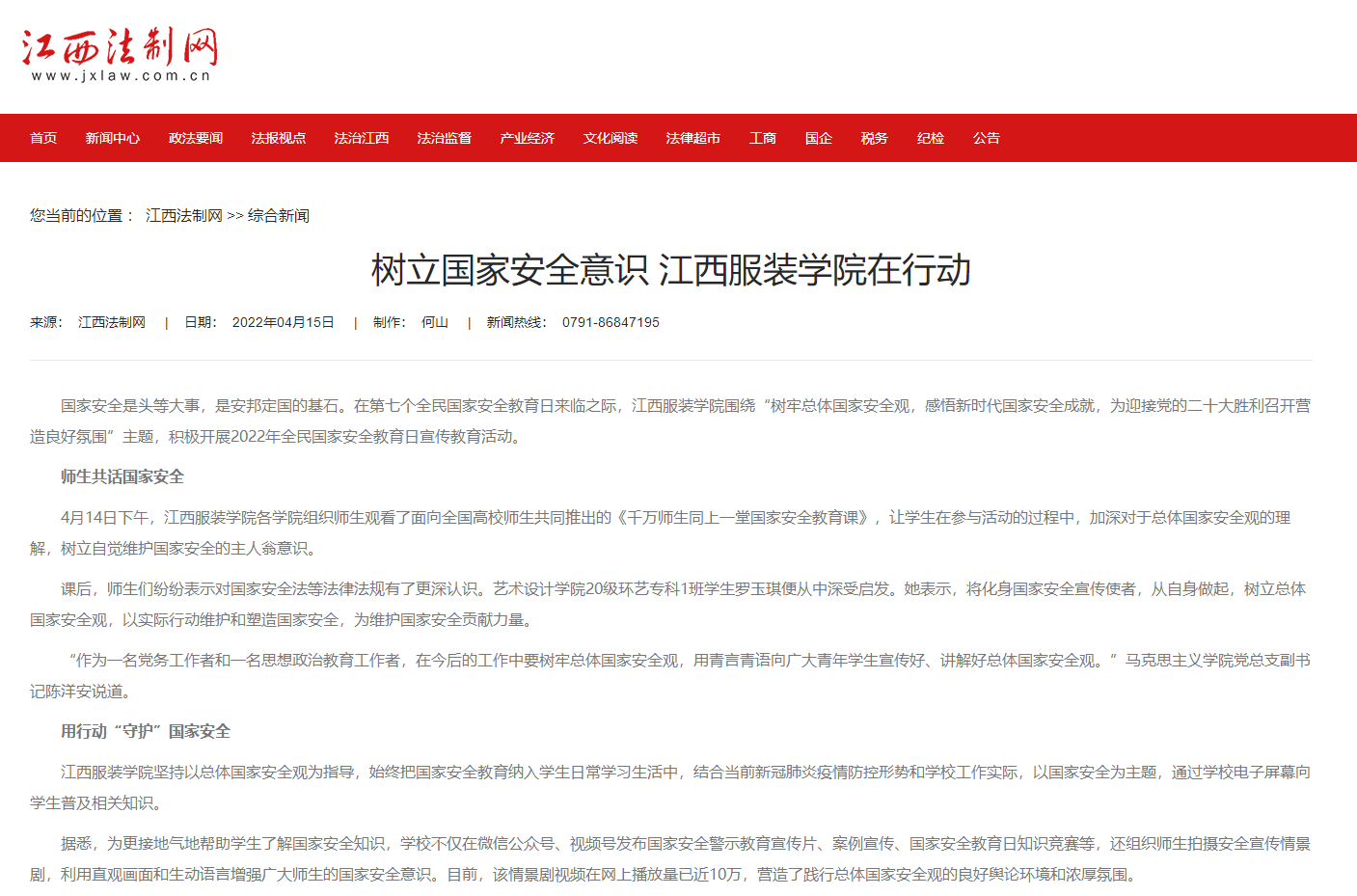 江西法制网:树立国家安全意识 江西服装学院在行动