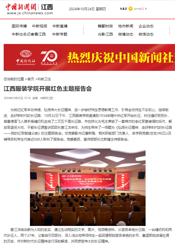 为铭记红军丰功伟绩,弘扬伟大长征精神,进一步做好师生思想教育工作,引导全校师生不忘初心、继续前进,走好新时代的长征路,10月22日下午,江西服装学院邀请到1934年随中央红军开始长征,时任缝纫班班长,背着德国飞人牌手摇缝纫机走完了二万五千里长征路,并在陕北为毛主席做了一套棉衣的老红军葛接调的后代,解放军退役大校,于都长征源宣讲团团长葛江洋来校,为师生带来了一场题为《弘扬长征精神,走好新时代的长征路——我的红军裁缝父亲》的主题报告会。校党委副书记唐新强,相关职能部门负责人,各学院党委(总支)书记以及辅导员和学生代表近500人聆听了报告会。党委委员、宣传部部长沈新建主持报告会。