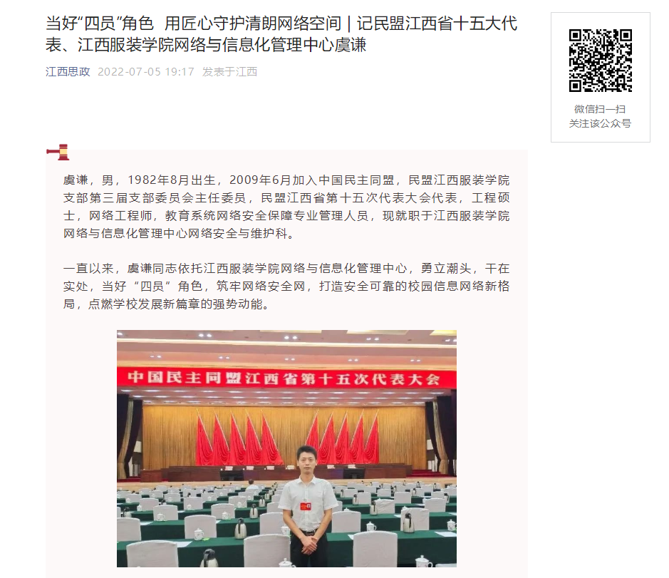 江西思政:当好“四员”角色 用匠心守护清朗网络空间 | 记民盟江西省十五大代表、江西服装学院网络与信息化管理中心虞谦