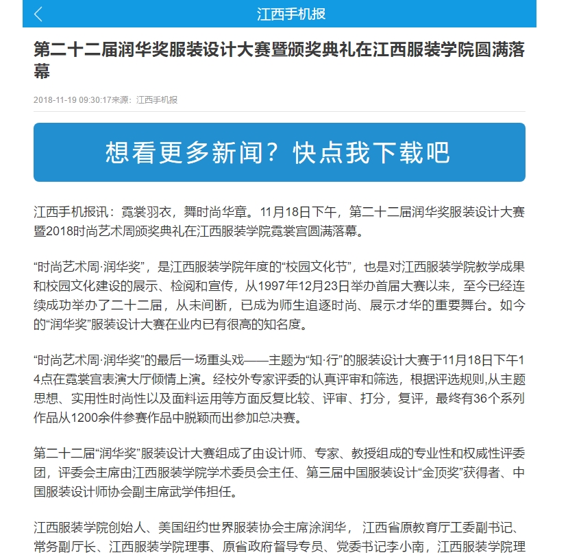 江西手机报讯:霓裳羽衣,舞时尚华章。11月18日下午,第二十二届润华奖服装设计大赛暨2018时尚艺术周颁奖典礼在江西服装学院霓裳宫圆满落幕。