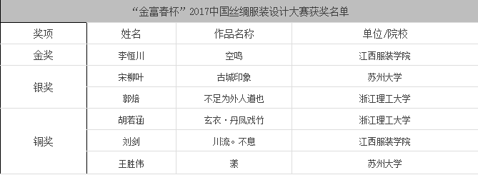 最终来自江西服装学院李恒川的《空鸣》和浙江理工大学陈淑丽的《MONET Garden》凭着独特的设计理念、精致的成衣效果摘下桂冠,分别获得2017中国丝绸服装设计大赛金奖和第五届中华嫁衣大赛金奖,同时其它奖项也悉数产生。