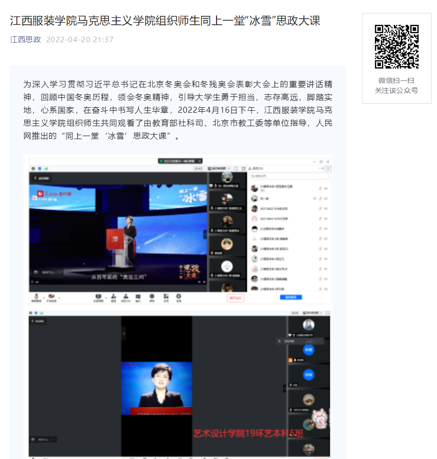 为深入学习贯彻习近平总书记在北京冬奥会和冬残奥会表彰大会上的重要讲话精神,回顾中国冬奥历程,领会冬奥精神,引导大学生勇于担当,志存高远,脚踏实地,心系国家,在奋斗中书写人生华章,2022年4月16日下午,江西服装学院马克思主义学院组织师生共同观看了由教育部社科司、北京市教工委等单位指导,人民网推出的“同上一堂‘冰雪’思政大课”。