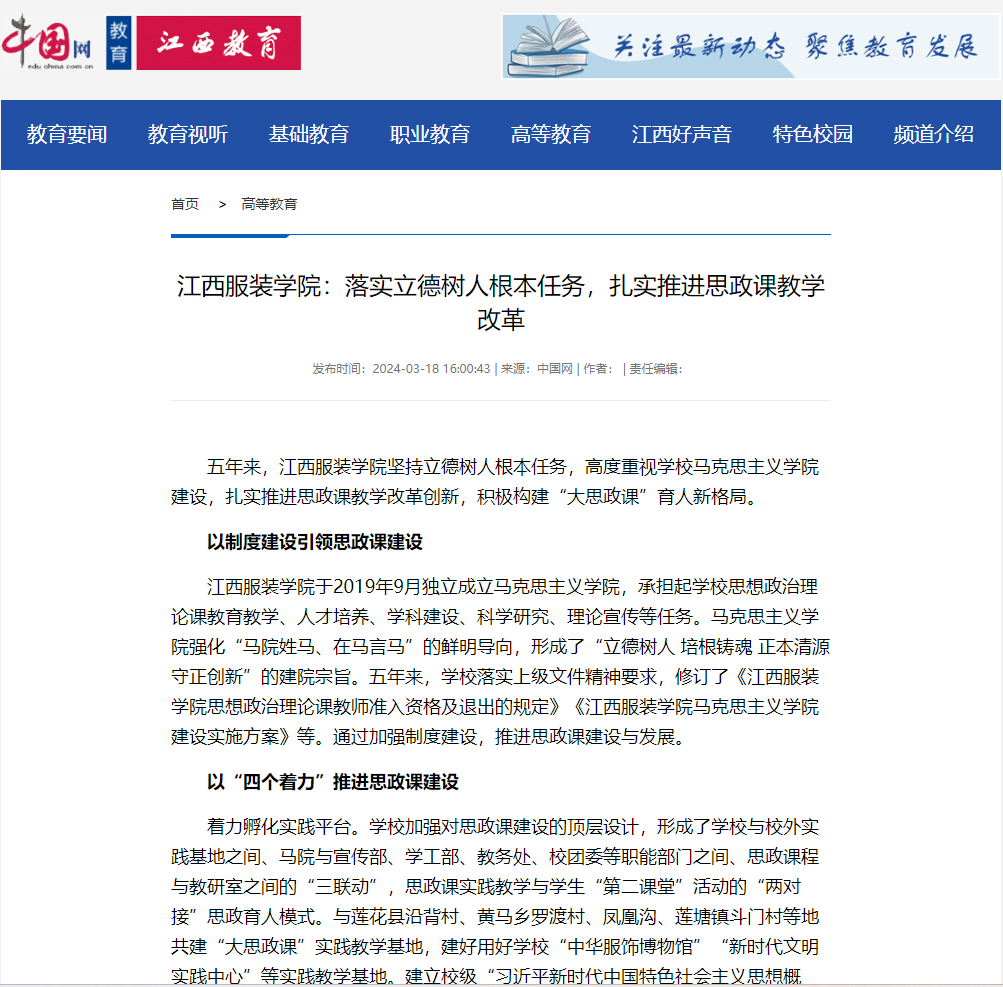 中国网:江西服装学院:落实立德树人根本任务,扎实推进思政课教学改革