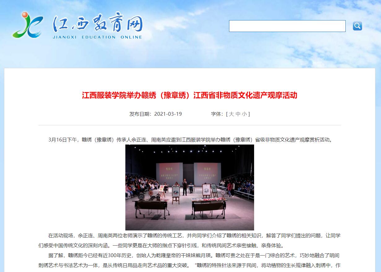新闻链接:江西教育网:江西服装学院举办赣绣(豫章绣)江西省非物质文化遗产观摩活动