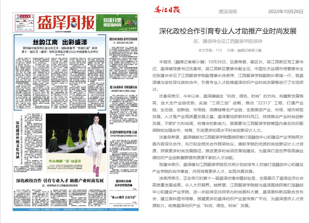 10月26日,区委常委、副区长、吴江高新区党工委书记、盛泽镇党委书记沈春荣,吴江高新区管委会副主任、中国东方丝绸市场管委会主任张建华会见了江西服装学院副理事长涂燕萍、校领导易城一行,就盛泽镇与该校深化政校合作,引育专业人才助推盛泽纺织产业时尚发展等进行了交流探讨。