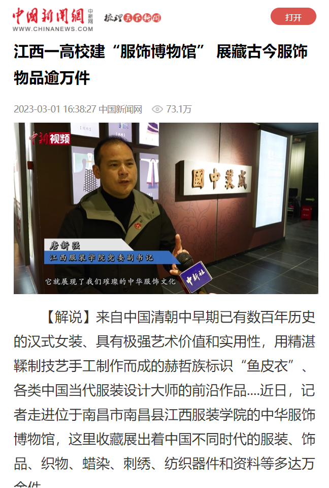 3月1日,中国新闻网以《江西一高校建“服饰博物馆” 展藏古今服饰物品逾万件》为题,深入报道我校“中华服饰博物馆” ,希望通过服饰文明建设,树立文化自信,让更多的学生、校友投身到中国服装强国的建设中,再次让中国纺织服装在世界散发出它璀璨的文化光芒。