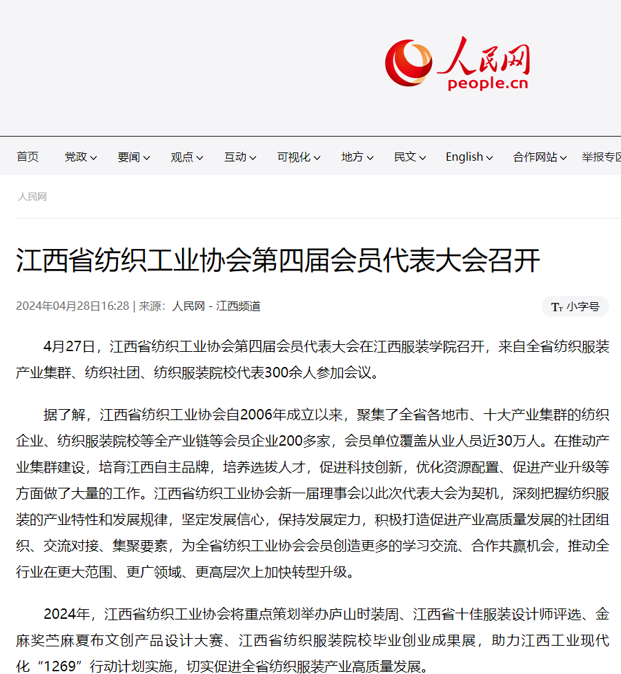 人民网:江西省纺织工业协会第四届会员代表大会召开