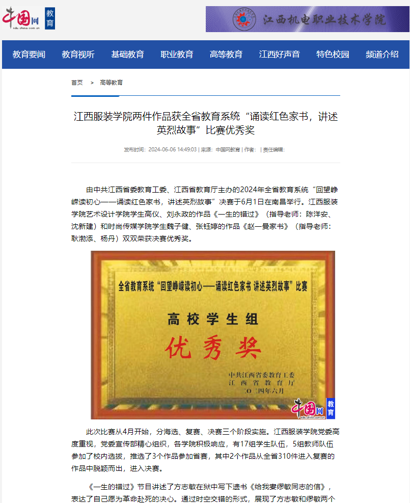 中国网:江西服装学院两件作品获全省教育系统“诵读红色家书,讲述英烈故事”比赛优秀奖