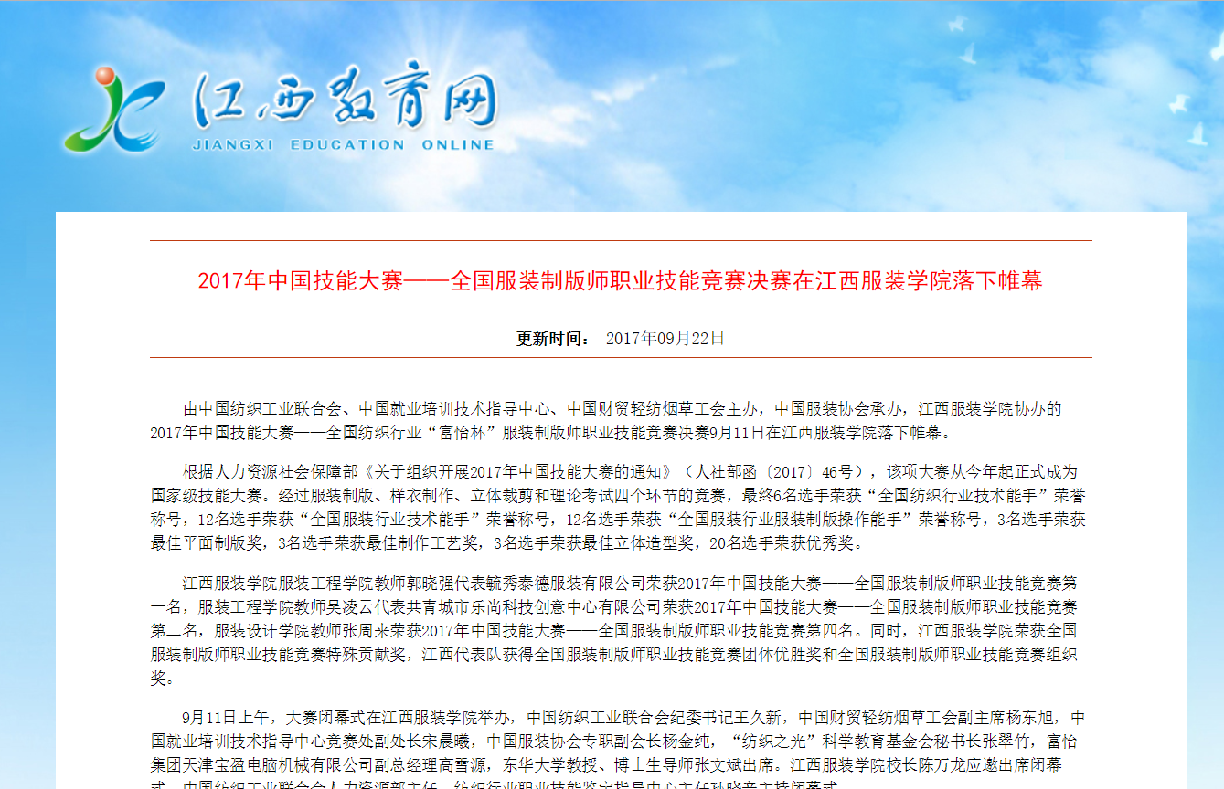 由中国纺织工业联合会、中国就业培训技术指导中心、中国财贸轻纺烟草工会主办,中国服装协会承办,江西服装学院协办的2017年中国技能大赛——全国纺织行业“富怡杯”服装制版师职业技能竞赛决赛9月11日在江西服装学院落下帷幕。