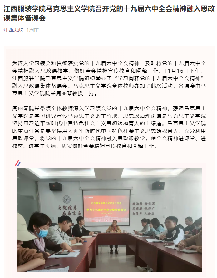 新闻链接:江西思政:江西服装学院马克思主义学院召开党的十九届六中全会精神融入思政课集体备课会