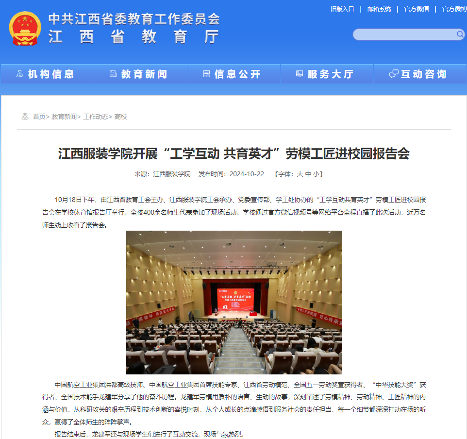 江西省教育厅官网:江西服装学院开展“工学互动 共育英才”劳模工匠进校园报告会
