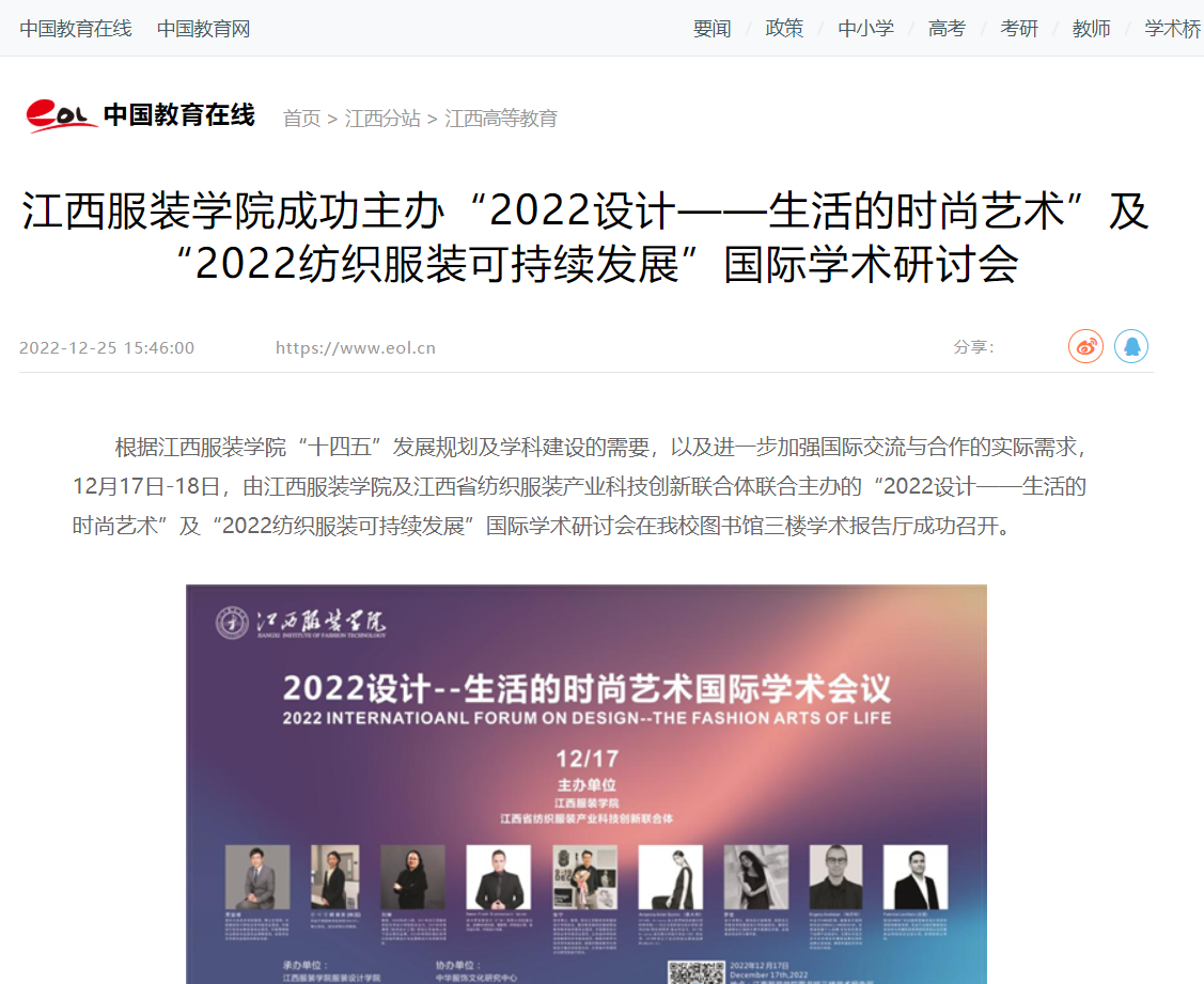 中国教育在线:江西服装学院成功主办“2022设计——生活的时尚艺术”及“2022纺织服装可持续发展”国际学术研讨会