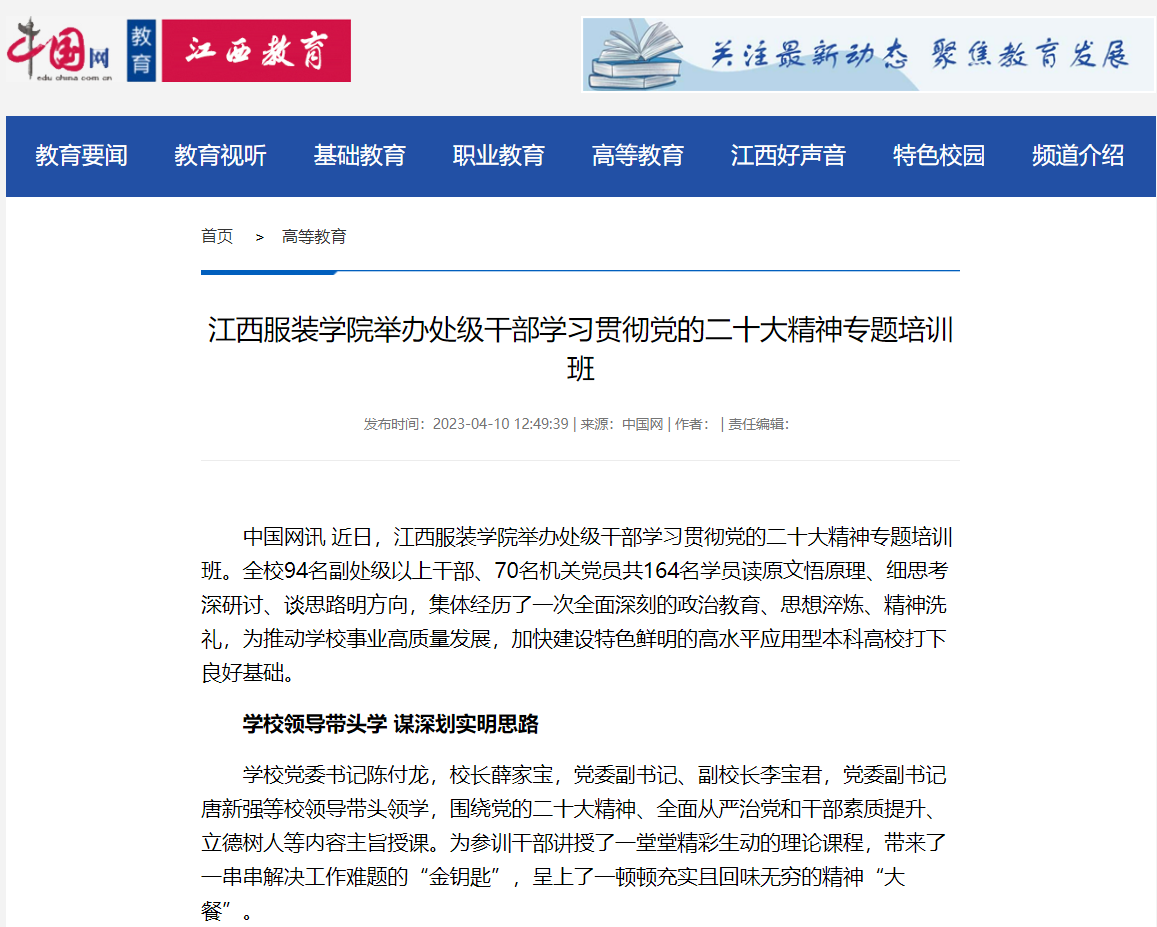 中国网:江西服装学院举办处级干部学习贯彻党的二十大精神专题培训班