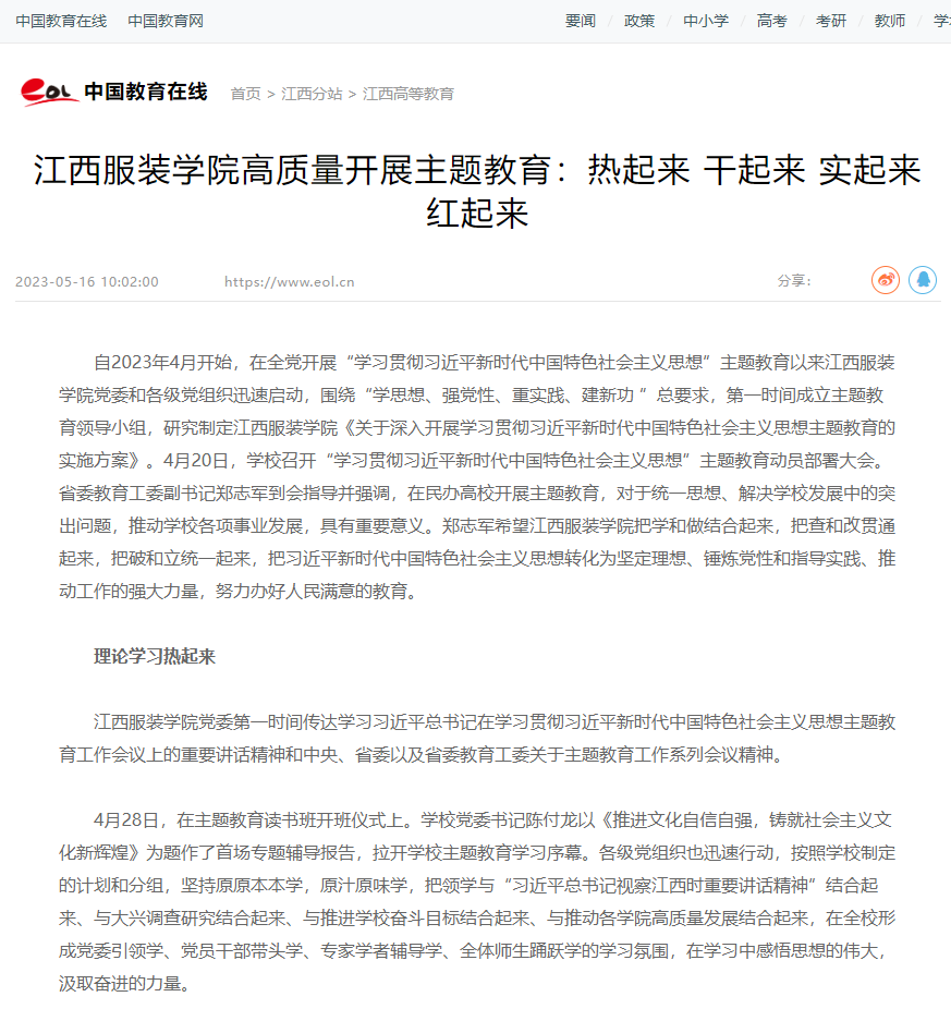 中国教育在线:江西服装学院高质量开展主题教育:热起来 干起来 实起来 红起来