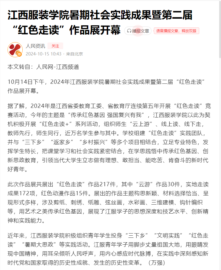 人民资讯:江西服装学院暑期社会实践成果暨第二届“红色走读”作品展开幕