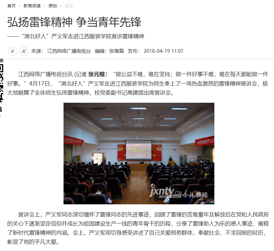 上一篇雷锋网:“湖北好人”严义军走进江西服装学院宣讲雷锋精神