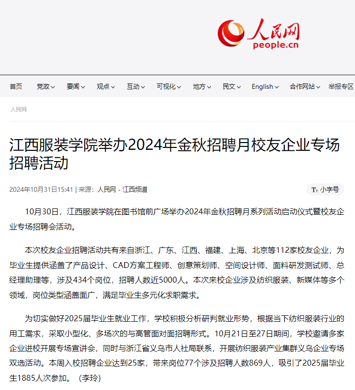 人民网:江西服装学院举办2024年金秋招聘月校友企业专场招聘活动