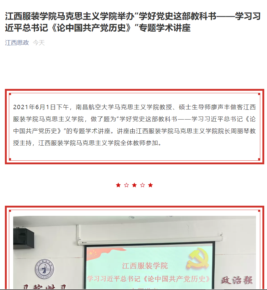 新闻链接:江西服装学院马克思主义学院举办“学好党史这部教科书——学习习近平总书记《论中国共产党历史》”专题学术讲座