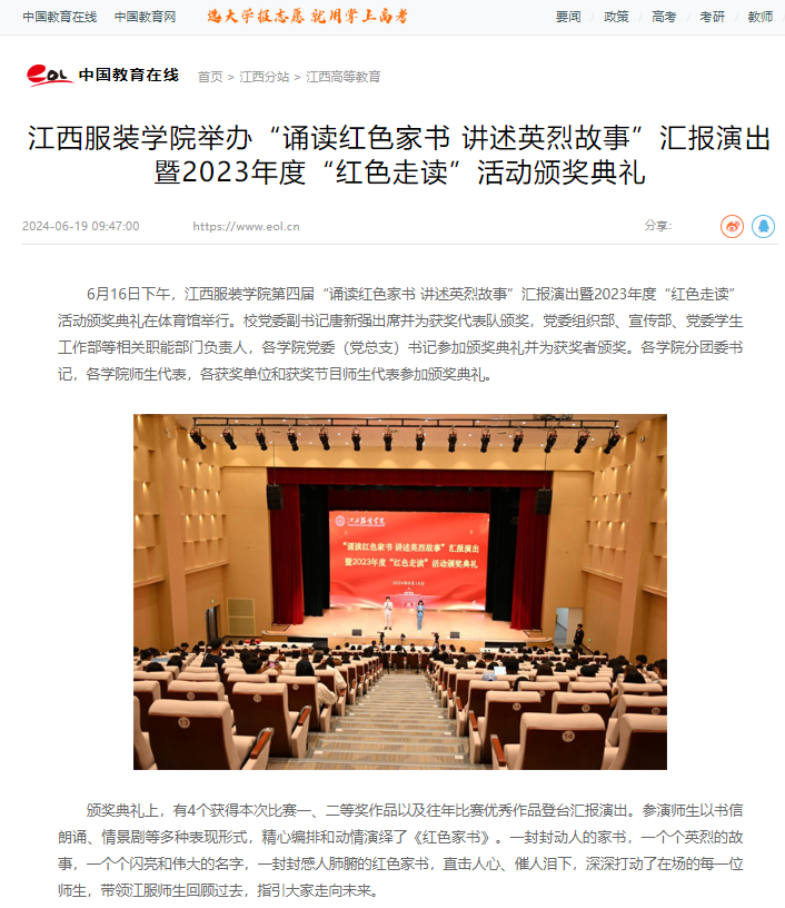 中国教育在线:江西服装学院举办“诵读红色家书 讲述英烈故事”汇报演出暨2023年度“红色走读”活动颁奖典礼