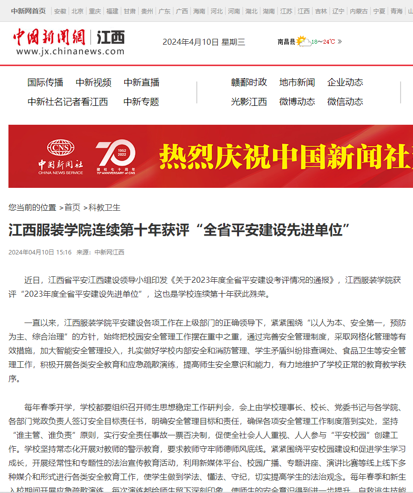 中国新闻网:江西服装学院连续第十年获评“全省平安建设先进单位”