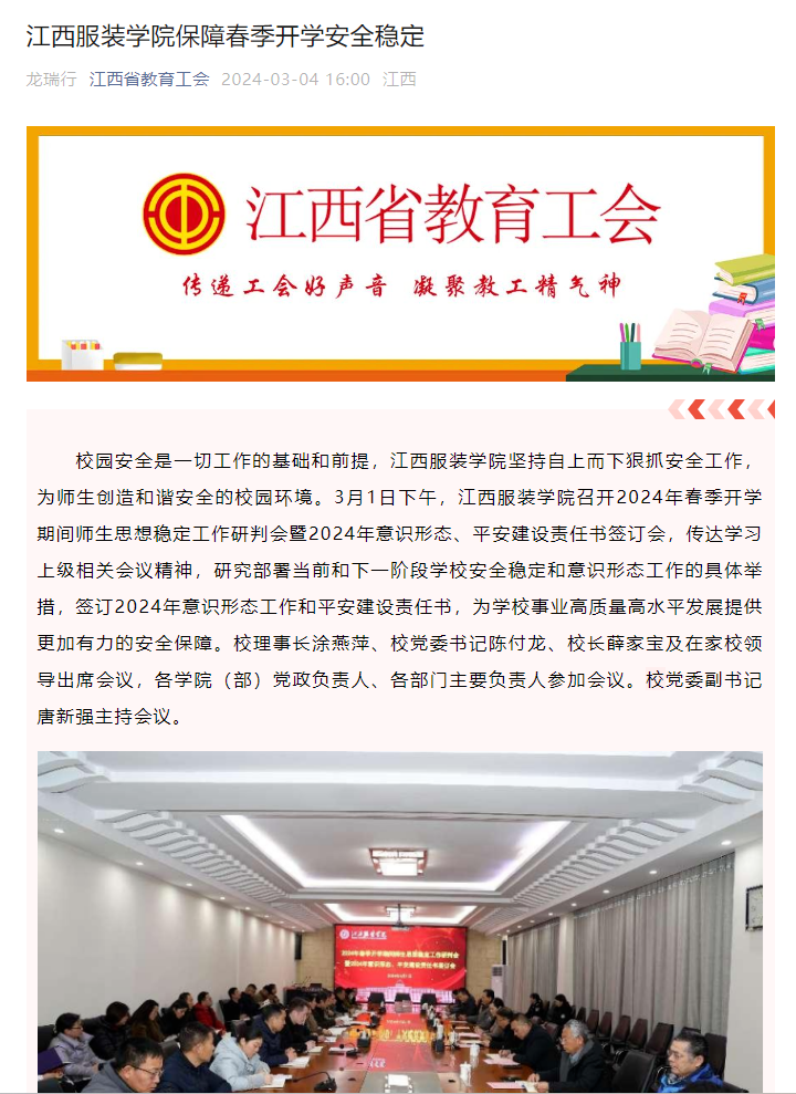 校园安全是一切工作的基础和前提,江西服装学院坚持自上而下狠抓安全工作,为师生创造和谐安全的校园环境。3月1日下午,江西服装学院召开2024年春季开学期间师生思想稳定工作研判会暨2024年意识形态、平安建设责任书签订会,传达学习上级相关会议精神,研究部署当前和下一阶段学校安全稳定和意识形态工作的具体举措,签订2024年意识形态工作和平安建设责任书,为学校事业高质量高水平发展提供更加有力的安全保障。校理事长涂燕萍、校党委书记陈付龙、校长薛家宝及在家校领导出席会议,各学院(部)党政负责人、各部门主要负责人参加会议。校党委副书记唐新强主持会议。