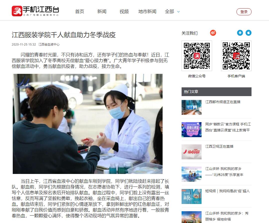 手机江西台对此进行了报道,以下为新闻链接:手机江西台:江西服装学院千人献血助力冬季战疫