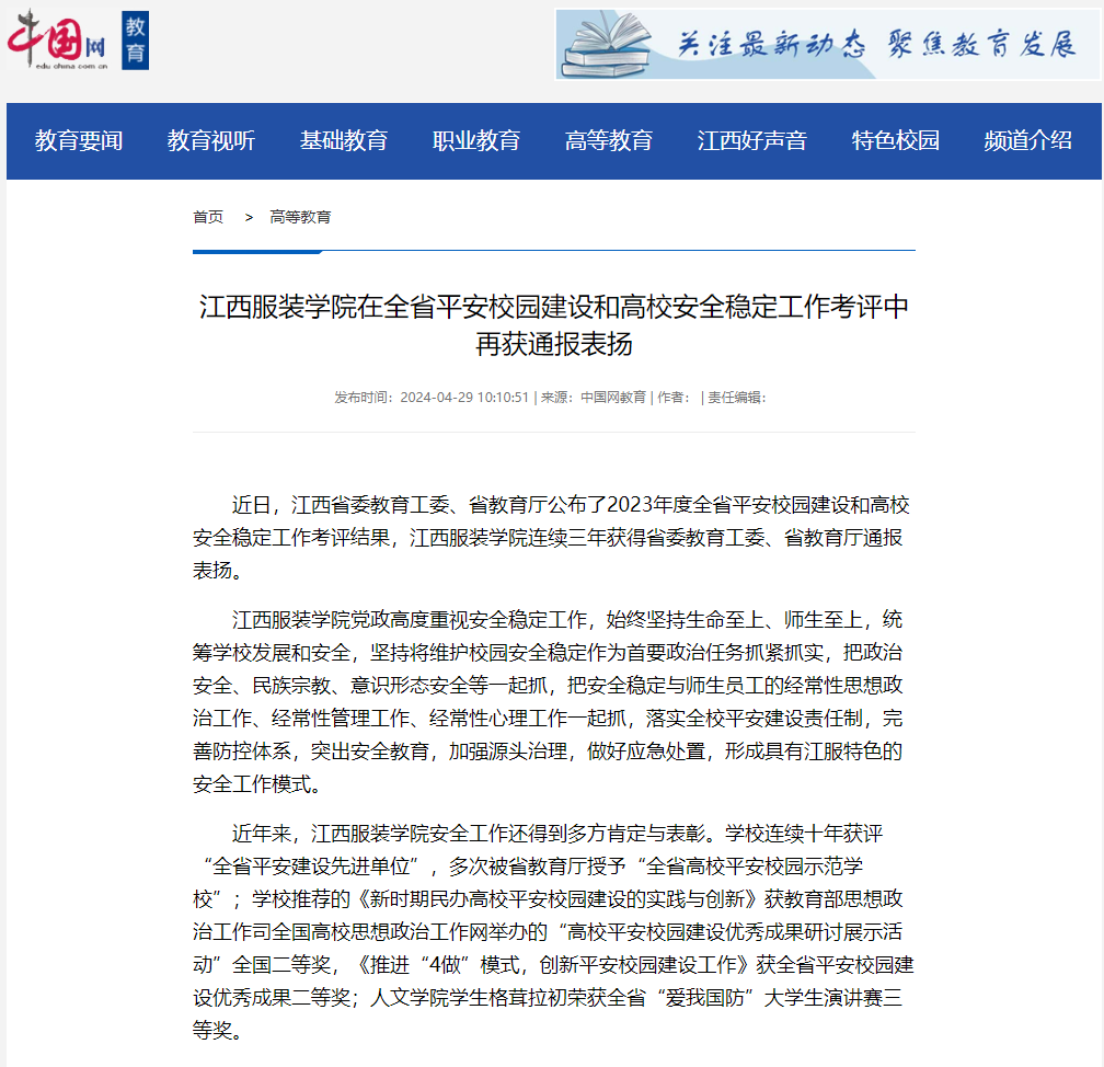 中国网:江西服装学院在全省平安校园建设和高校安全稳定工作考评中再获通报表扬