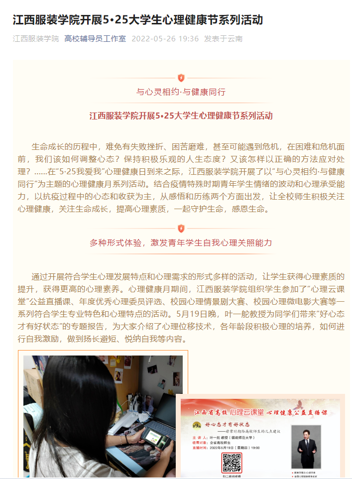 上一篇江西省教育厅官网:与心灵相约 与健康同行——江西服装学院开展5·25大学生心理健康节系列活动