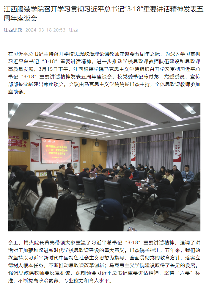 江西思政:江西服装学院召开学习贯彻习近平总书记“3·18”重要讲话精神发表五周年座谈会