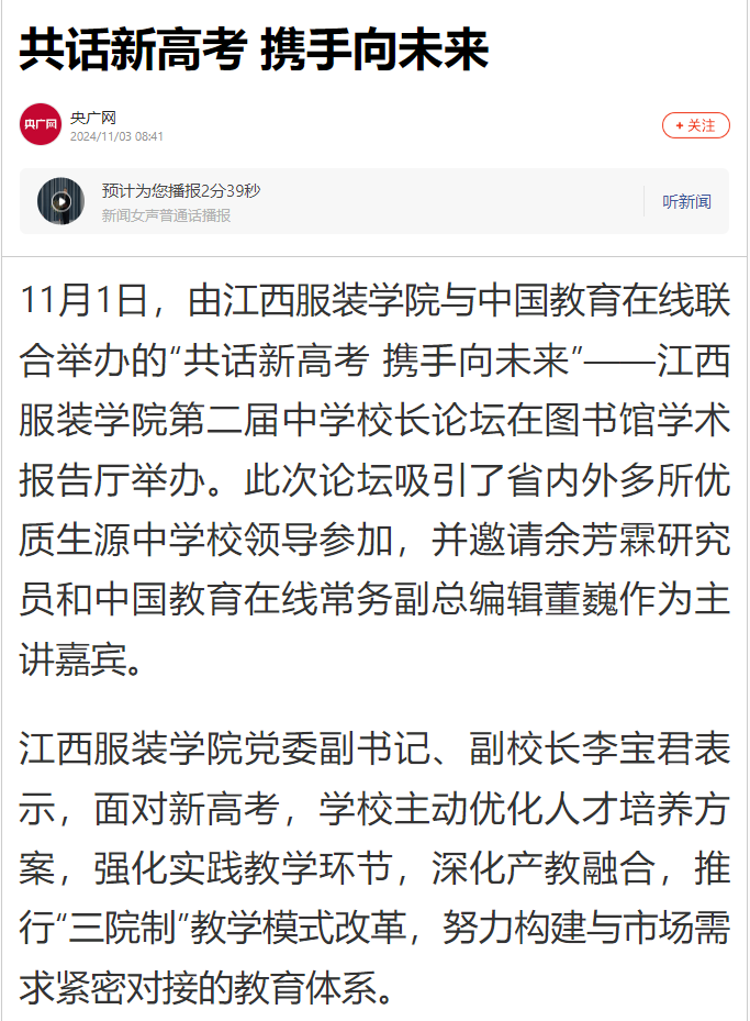 央广网:共话新高考 携手向未来——江西服装学院第二届中学校长论坛顺利举行