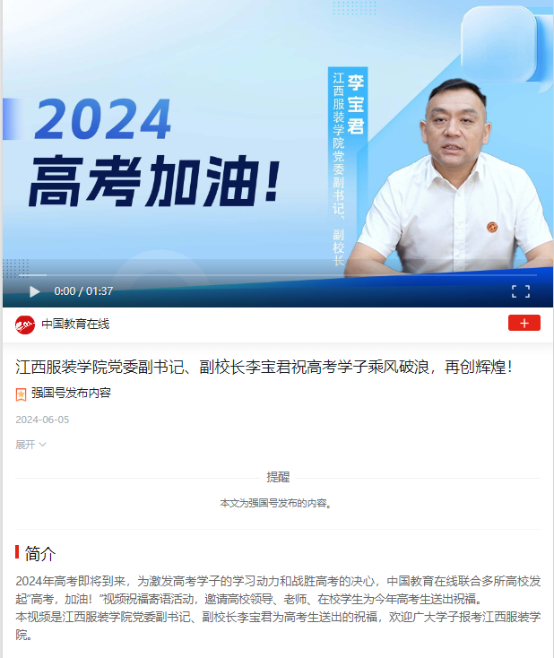 新闻链接:学习强国:江西服装学院党委副书记、副校长李宝君祝高考学子乘风破浪,再创辉煌!