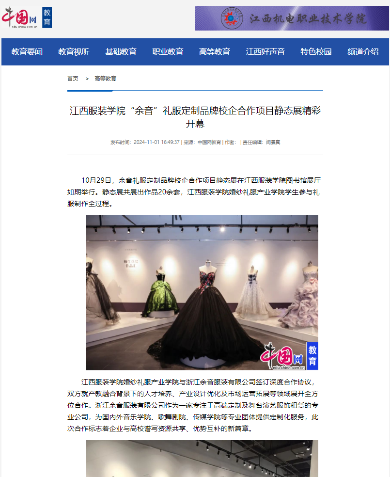 中国网:江西服装学院“余音”礼服定制品牌校企合作项目静态展精彩开幕