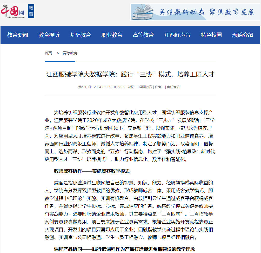 中国网:江西服装学院大数据学院:践行“三协”模式,培养工匠人才