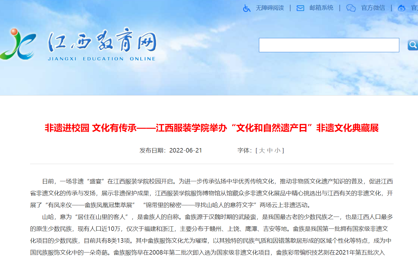江西省教育厅官网:非遗进校园 文化有传承——江西服装学院举办“文化和自然遗产日”非遗文化典藏展