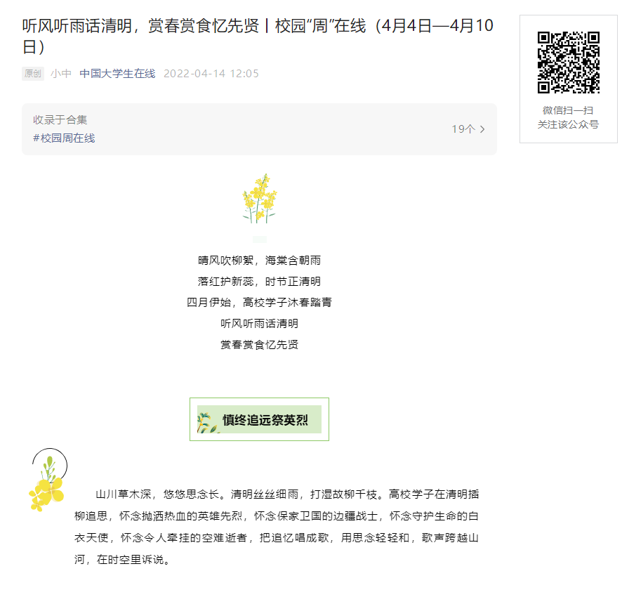 中国大学生在线:听风听雨话清明,赏春赏食忆先贤丨校园“周”在线(4月4日—4月10日)