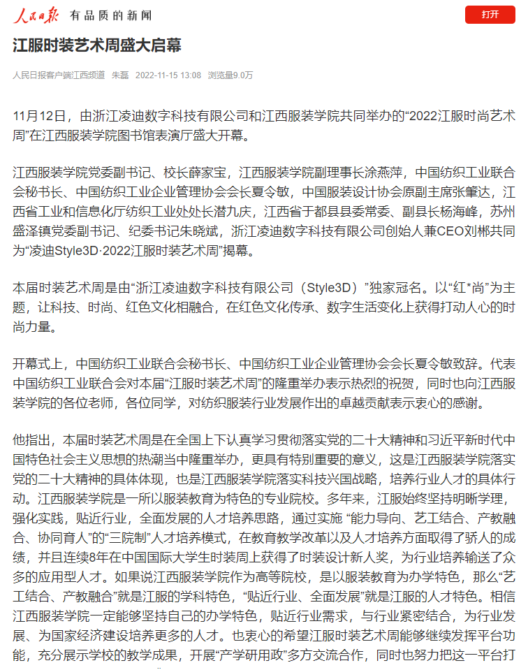 11月12日,由浙江凌迪数字科技有限公司和江西服装学院共同举办的“2022江服时尚艺术周”在江西服装学院图书馆表演厅盛大开幕。中国纺织工业联合会秘书长、中国纺织工业企业管理协会会长夏令敏,江西服装学院党委副书记、校长薛家宝,江西服装学院副理事长涂燕萍,中国服装设计师协会原副主席张肇达,江西省工业和信息化厅纺织工业处处长潜九庆,江西省于都县县委常委、副县长杨海峰,苏州盛泽镇党委副书记、纪委书记朱晓斌,浙江凌迪数字科技有限公司创始人兼CEO刘郴共同为“凌迪Style3D·2022江服时装艺术周”揭幕。