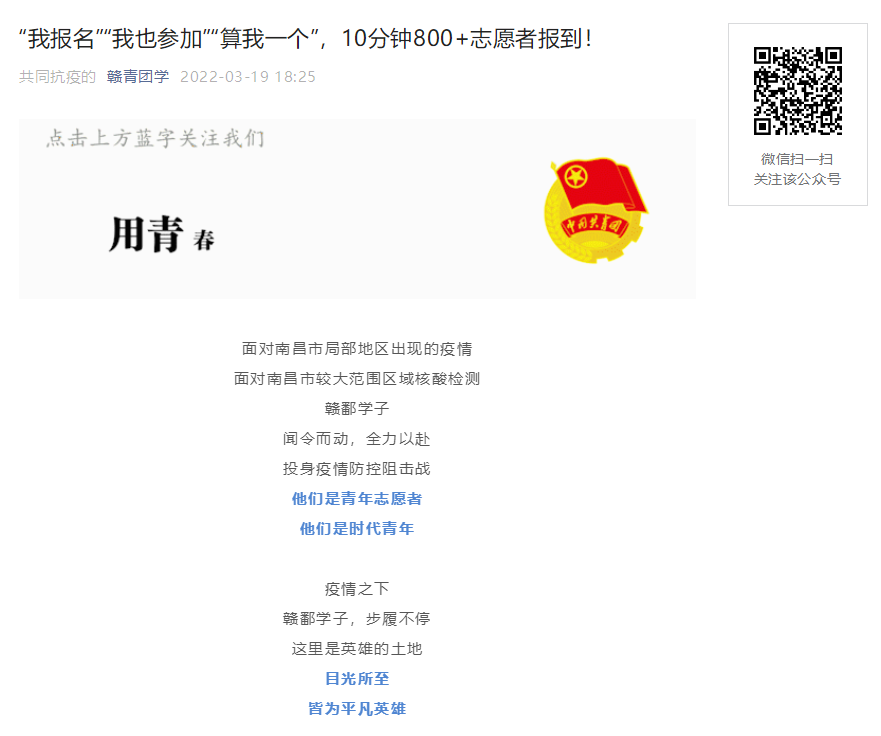赣青团学:“我报名”“我也参加”“算我一个”,10分钟800+志愿者报到!