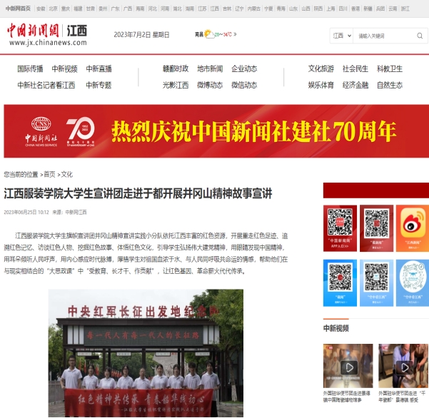 江西服装学院大学生旗帜宣讲团井冈山精神宣讲实践小分队依托江西丰富的红色资源,开展重走红色足迹、追溯红色记忆、访谈红色人物、挖掘红色故事、体悟红色文化,引导学生弘扬伟大建党精神,用眼睛发现中国精神,用耳朵倾听人民呼声,用内心感应时代脉搏,厚植学生对祖国血浓于水、与人民同呼吸共命运的情感,帮助他们在与现实相结合的“大思政课”中“受教育、长才干、作贡献”,让红色基因、革命薪火代代传承。中国新闻网对此进行了宣传报道,可以扫码观看原文: