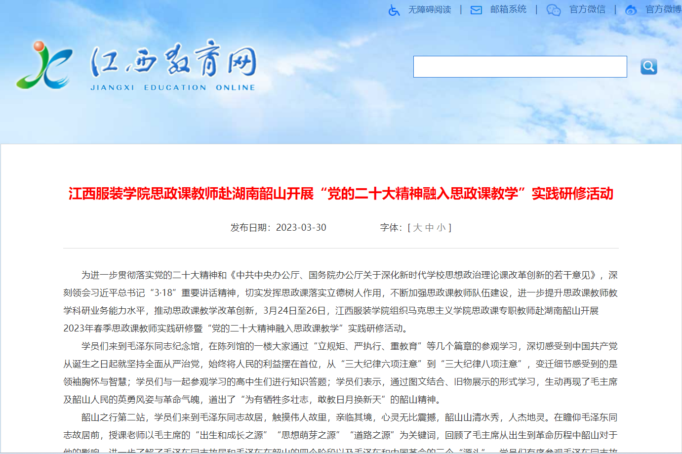 江西省教育厅官网:江西服装学院思政课教师赴湖南韶山开展“党的二十大精神融入思政课教学”实践研修活动