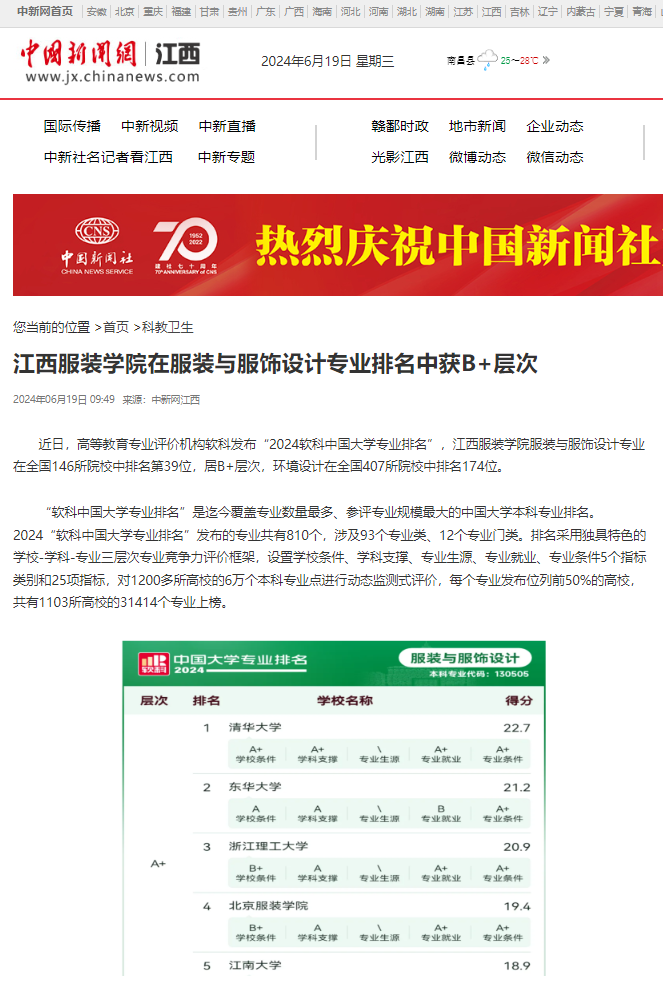 中国新闻网:江西服装学院在服装与服饰设计专业排名中获B+层次