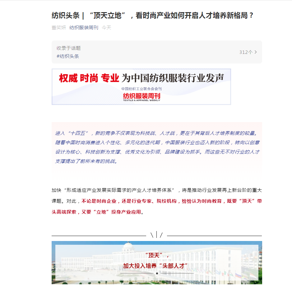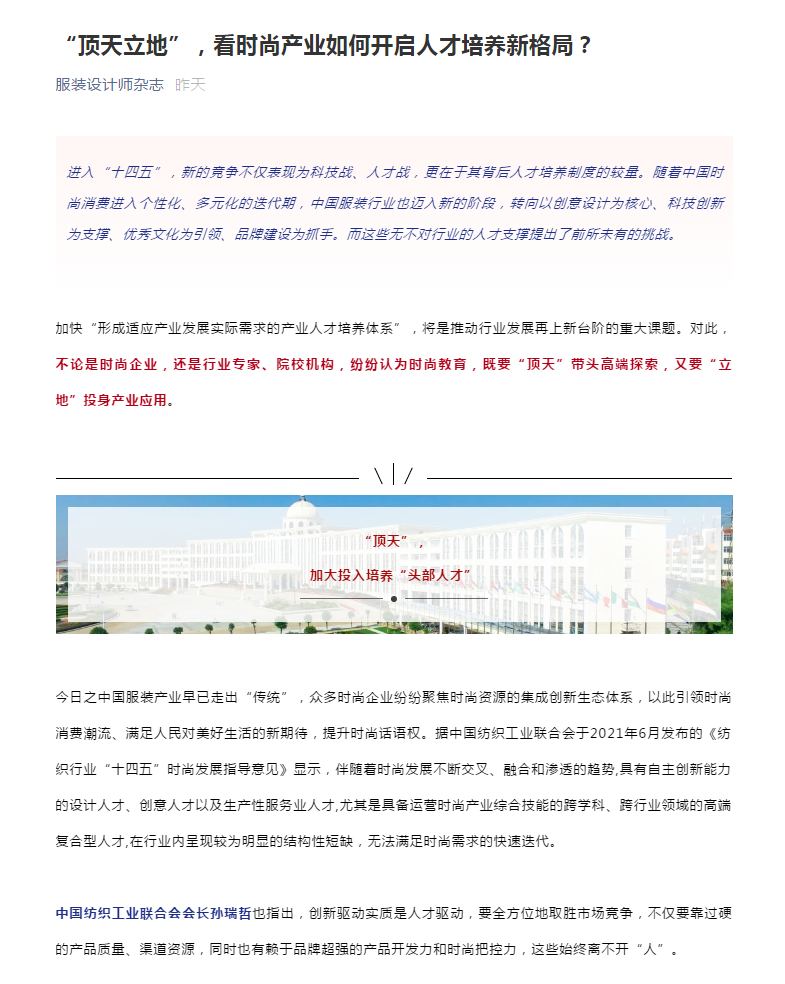 近日,多家媒体以“‘顶天立地’,看时尚产业如何开启人才培养新格局”为题,从“加大投入培养‘头部人才’”和“脚踏实地培养留得住人才”两方面报道了我校人才培养新格局。加快“形成适应产业发展实际需求的产业人才培养体系”,将是推动行业发展再上新台阶的重大课题。对此,不论是时尚企业,还是行业专家、院校机构,纷纷认为时尚教育,既要“顶天”带头高端探索,又要“立地”投身产业应用。我校一直专注于服装教育特色,以特色凝练核心竞争力,努力把学校建设成服装行业及相关产业市场需要的人才高地。