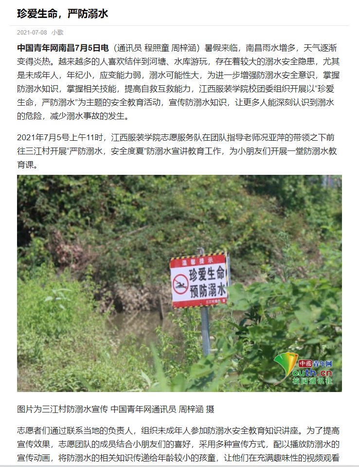 新闻链接:中国青年网报道我校“三下乡”暑期社会实践活动:珍爱生命,严防溺水
