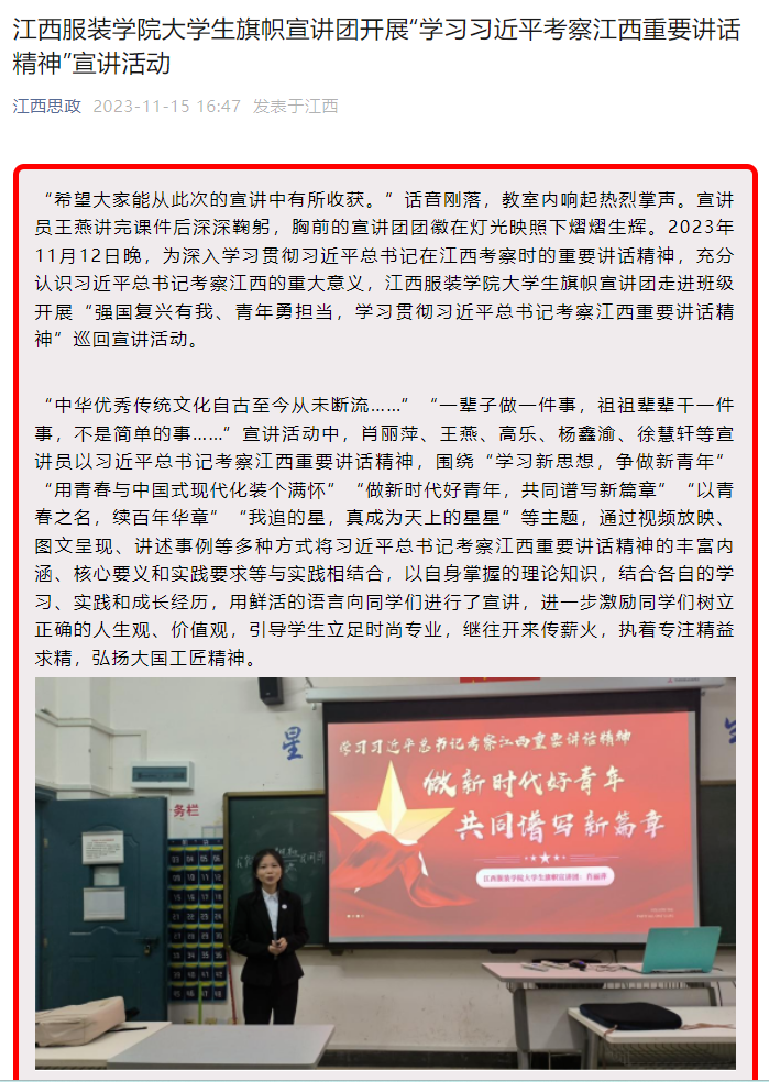 江西思政:江西服装学院大学生旗帜宣讲团开展“学习习近平考察江西重要讲话精神”宣讲活动