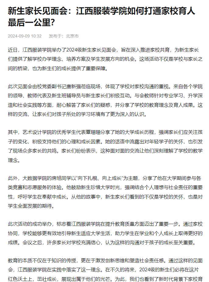 搜狐网:新生家长见面会:江西服装学院如何打通家校育人最后一公里?