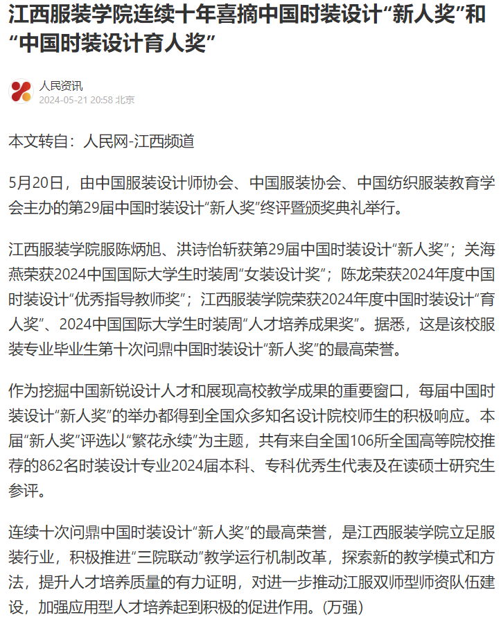 人民资讯:江西服装学院连续十年喜摘中国时装设计“新人奖”和“中国时装设计育人奖”