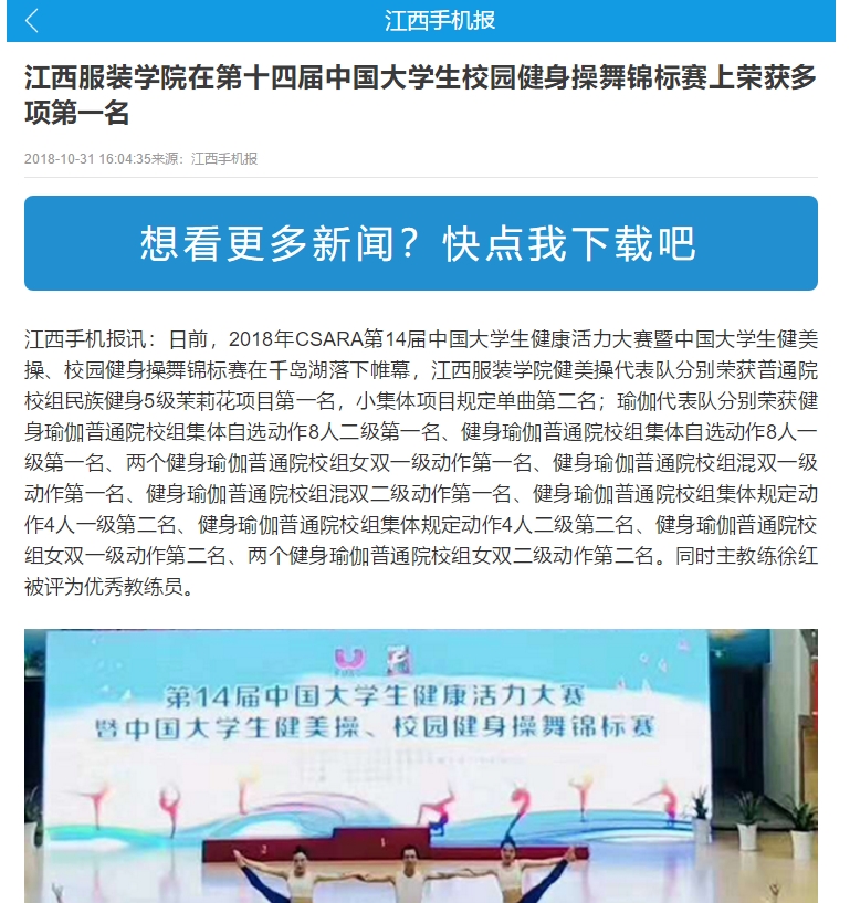 江西手机报讯:日前,2018年CSARA第14届中国大学生健康活力大赛暨中国大学生健美操、校园健身操舞锦标赛在千岛湖落下帷幕,江西服装学院健美操代表队分别荣获普通院校组民族健身5级茉莉花项目第一名,小集体项目规定单曲第二名;瑜伽代表队分别荣获健身瑜伽普通院校组集体自选动作8人二级第一名、健身瑜伽普通院校组集体自选动作8人一级第一名、两个健身瑜伽普通院校组女双一级动作第一名、健身瑜伽普通院校组混双一级动作第一名、健身瑜伽普通院校组混双二级动作第一名、健身瑜伽普通院校组集体规定动作4人一级第二名、健身瑜伽普通院校组集体规定动作4人二级第二名、健身瑜伽普通院校组女双一级动作第二名、两个健身瑜伽普通院校组女双二级动作第二名。同时主教练徐红被评为优秀教练员。